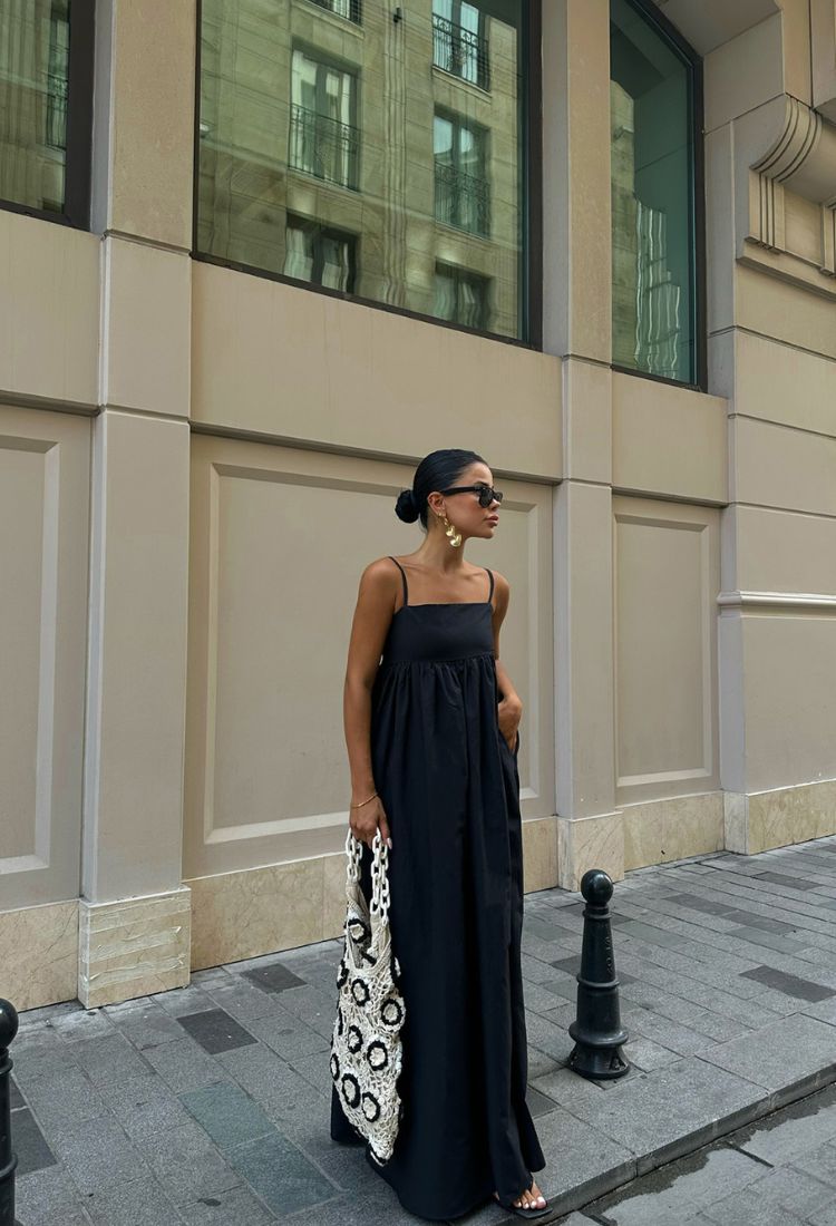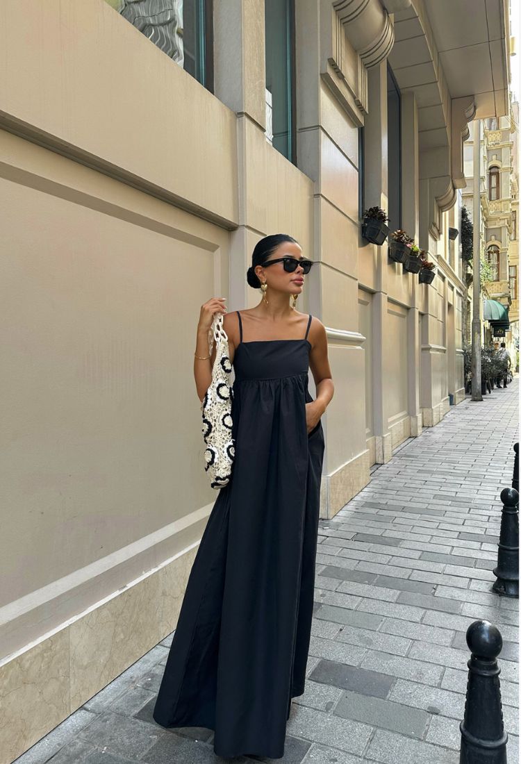 Czarna sukienka na cienkich ramkach . Sukienka w stylu boho ,rozkloszowana i z kieszeniami po bokach. Sukienka można założysz na każdą okazję, przyjęcie koktajlowe czy wypad na weekend , zyskasz bardzo stylowy wygląd. Jakość premium