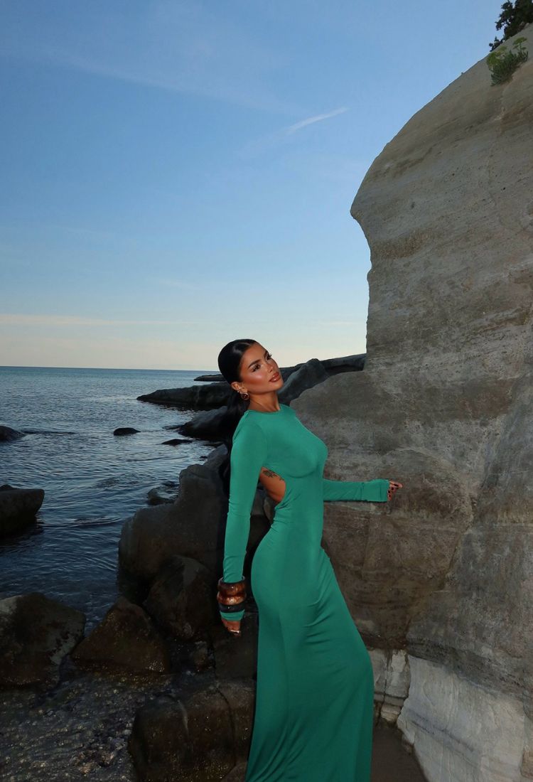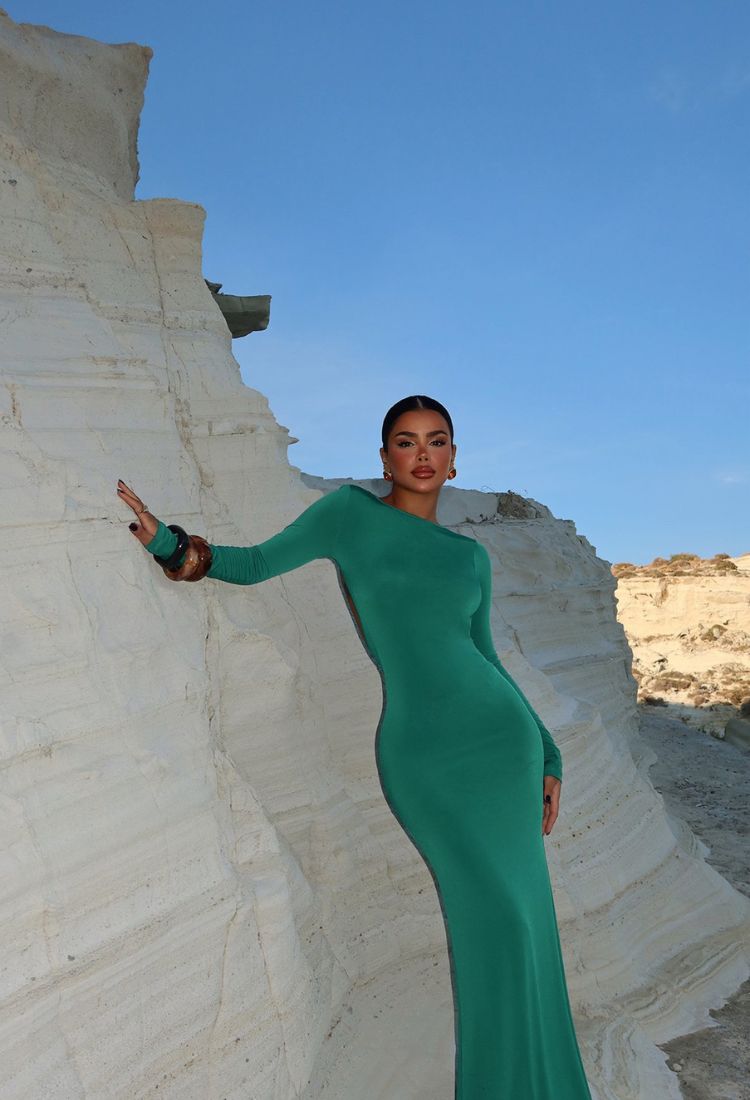 Długa, elegancka sukienka w kształcie syrenki to synonim wyrafinowanego stylu i klasy. Dopasowany krój idealnie podkreśla kobiecą sylwetkę, przylegając do ciała aż po linię bioder, a następnie delikatnie rozszerza się ku dołowi, tworząc charakterystyczny fason syrenki. Sukienka ma długie rękawy, które dodają jej elegancji, natomiast odkryte plecy wprowadzają element zmysłowości i subtelnej odwagi. To doskonały wybór na wyjątkowe okazje, gdyż łączy w sobie szyk, kobiecość i niepowtarzalny urok.