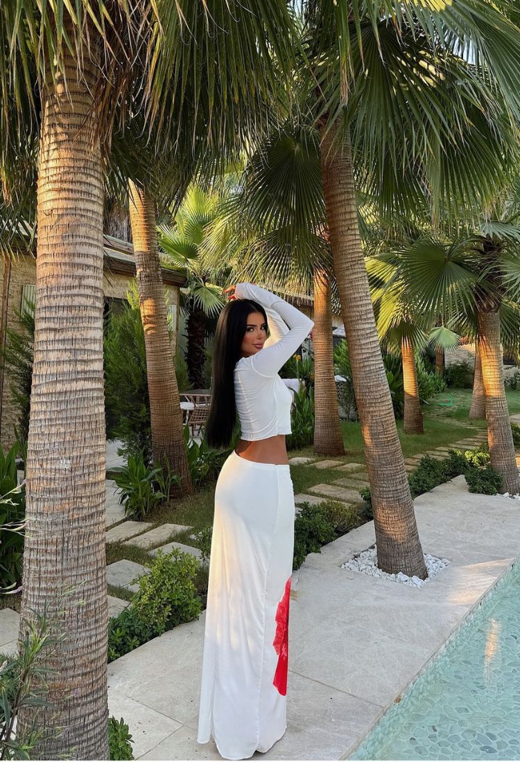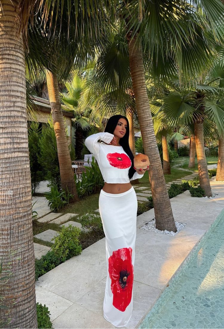 Cudny komplet, uszyty z wysokiej jakości materiału o nie tuzinkowej delikatności w materiale. Bluzka na długi siateczkowy rękaw z dużym makiem na przodzie i długa spódnica. Komplet na każda okazje. Jakość premium