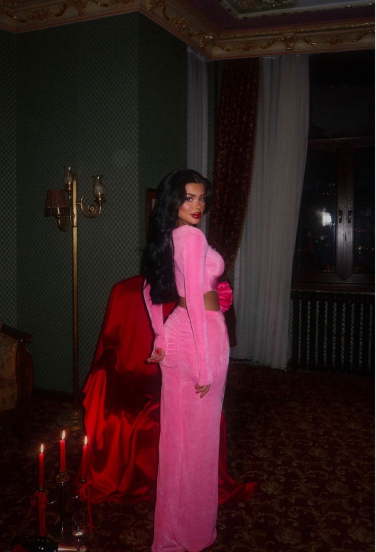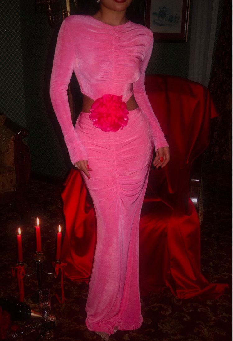 Elegancka maxi sukienka to wyjątkowa propozycja dla kobiet ceniących oryginalność i styl. Wykonana z luksusowego materiału, zachwyca subtelnymi marszczeniami na długich rękawach, które dodają jej niepowtarzalnego charakteru i delikatnie podkreślają sylwetkę. Sukienka posiada głębokie rozcięcia po bokach, które pięknie eksponują nogi, a także zmysłowe wycięcie na plecach, nadając całości wyrafinowanego uroku. Z przodu uwagę przyciąga duża, doczepiana róża – efektowny detal, który dodaje kreacji artystycznego i romantycznego wyrazu. To idealny wybór na gale, przyjęcia czy eleganckie wieczorne wyjścia, gdzie każda kobieta chce poczuć się wyjątkowo.