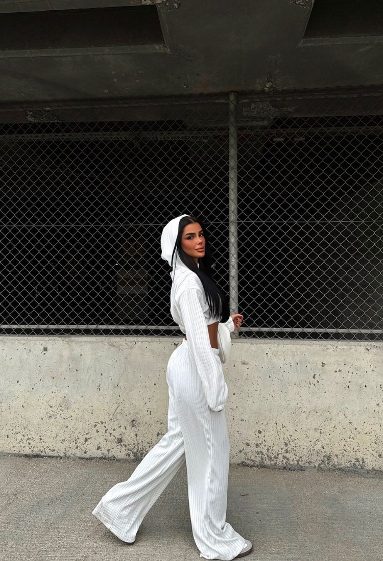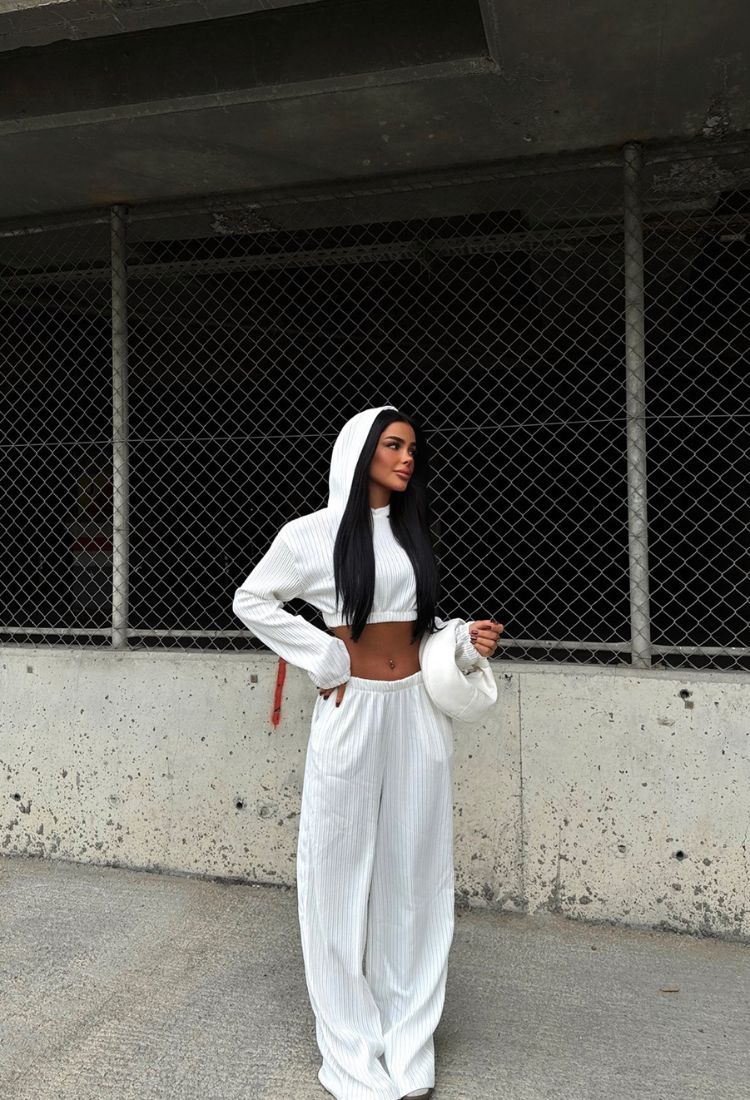Stylowy komplet w paski składający się z krótkiej bluzy z kapturem oraz szerokich spodni. Bluza wyróżnia się luźnym krojem, ściągana na dole gumką, co pozwala na dopasowanie do sylwetki, a kaptur dodaje jej casualowego charakteru. Spodnie są szerokie, wygodne, z praktycznymi kieszeniami po bokach, idealne na co dzień. Całość wykonana z lekkiego materiału w modny wzór w paski, który dodaje stylizacji oryginalności. Ten komplet świetnie sprawdzi się zarówno na spacer, jak i na spotkanie z przyjaciółmi, łącząc wygodę z ponadczasowym stylem.