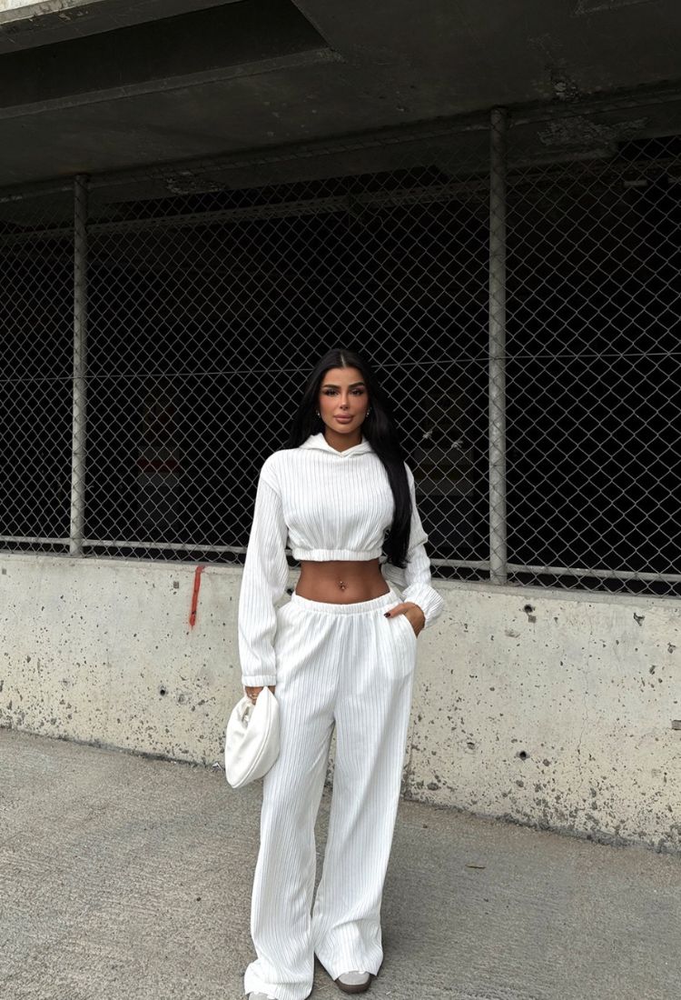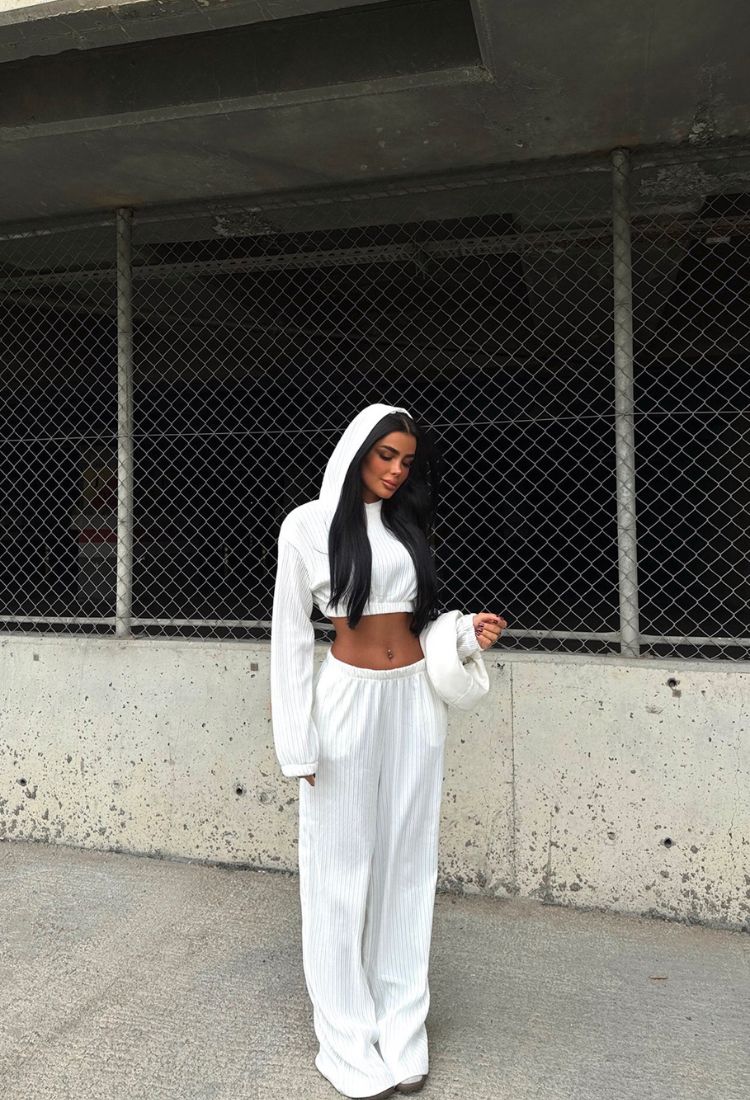 Komplet Krótka Bluza Z Kapturem+Szerokie Spodnie Biały -E140