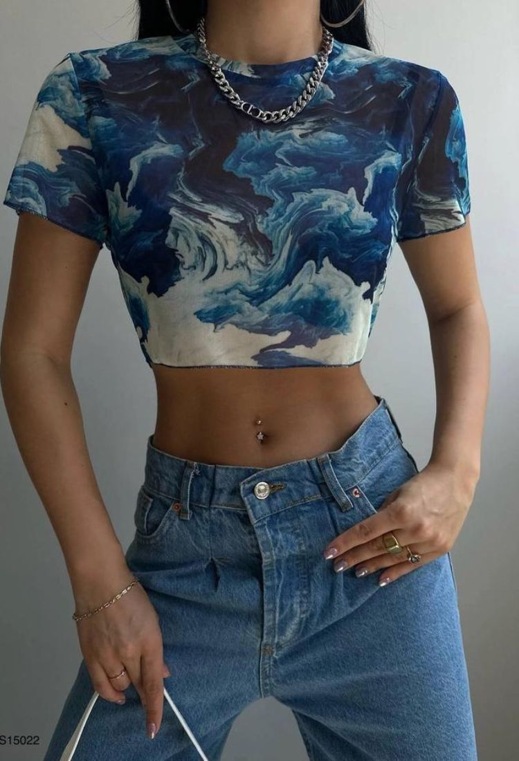 Krótki Top Tiulowy Na Krótki Rękaw Niebieski- A401